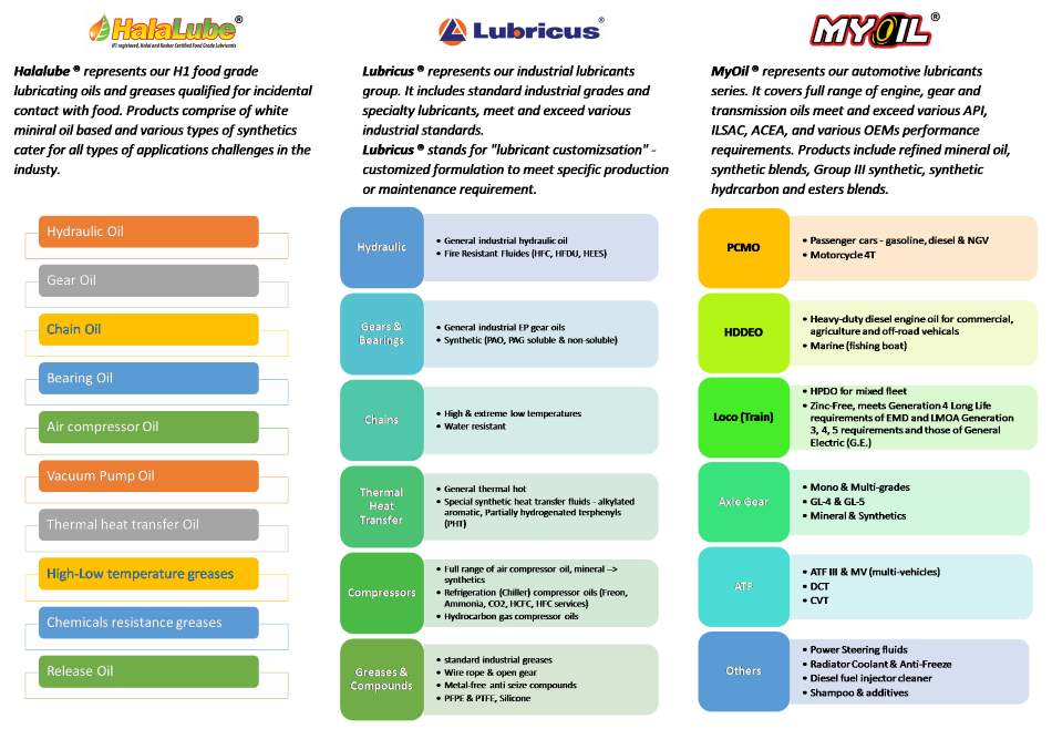 Full range of industrial lubricants, mineral oil based, synthetic PAO, PAG, Polyolester, Diester, Polyglycol PAG, PFPE, Silicone, etc.. |